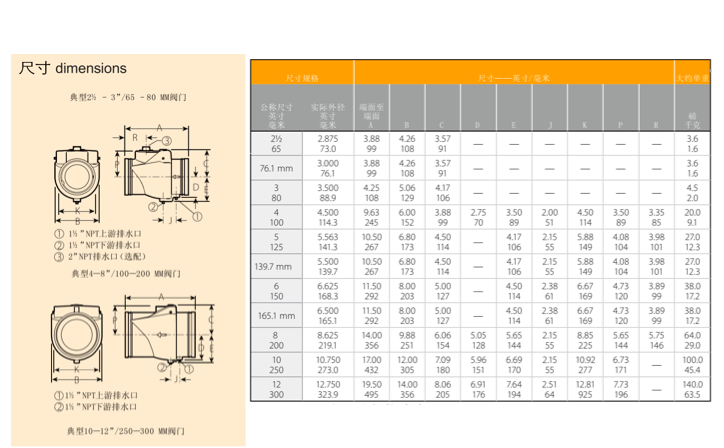 AS-C1系列沟槽止回阀是一款计算机辅助设计开发出来的阀门,流体动力学效率及高。4-12”/100-300mm尺寸规格阀门,流体动力学效率极高。4-12”/100-300mm尺寸规格阀门配备整体橡胶包覆阀板,提供出众的耐腐蚀性能。这种单一阀板设计结合弹簧辅助特色功能,使得阀门动作时不会出现拍击现象。4”/100mm及以上尺寸的阀门带有上游和下游排水口以及焊接镍阀座结构。所有尺寸的AS-C1系列止回阀均可垂直位置或水平位置安装,可在低至5英尺压头的条件下提供无泄漏密封。每一阀门均在工厂测试到500psi/3440kPa。用于最高压力达250psi/1725kPa的场合。沟槽端口设计允许利用两个接头方便快速地进行安装。